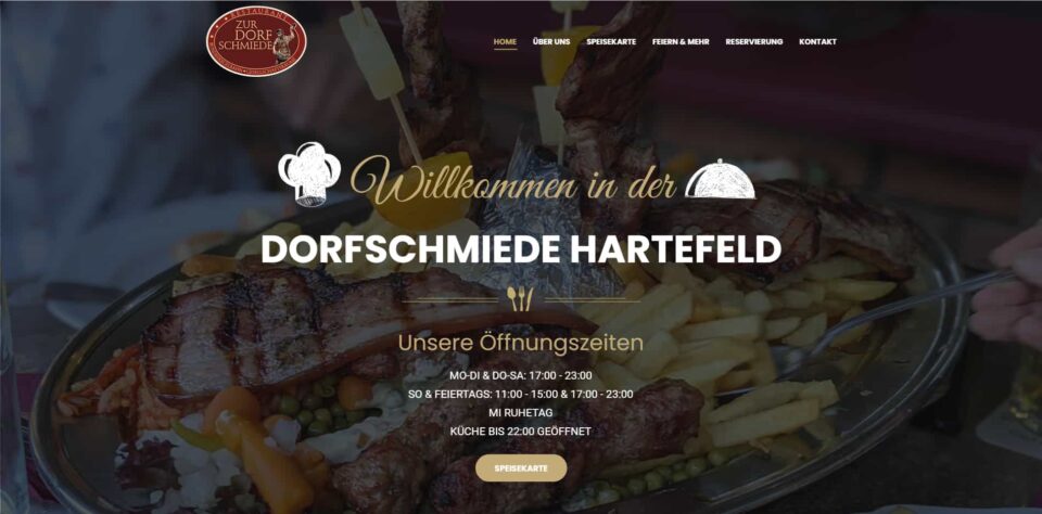 Relaunch der Website des Restaurants Dorfschmiede Hartefeld. Einladendes Designkonzept mit ausführlicher Speisekarte.